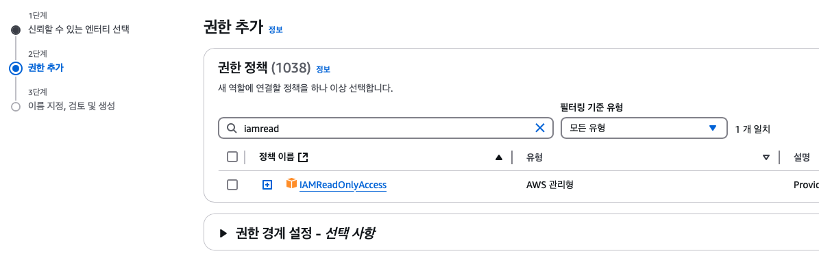 해당 역할에 추가할 권한을 찾는데 만약 EC2 VM에서 IAM 리스트를 확인하는 명령어를 쓰고자 한다면 IAM Read 권한이 필요할 것이다. 그래서 예시로 아래와 같이 읽기전용 권한정책을 찾아 체크한 후 넘어간다.
