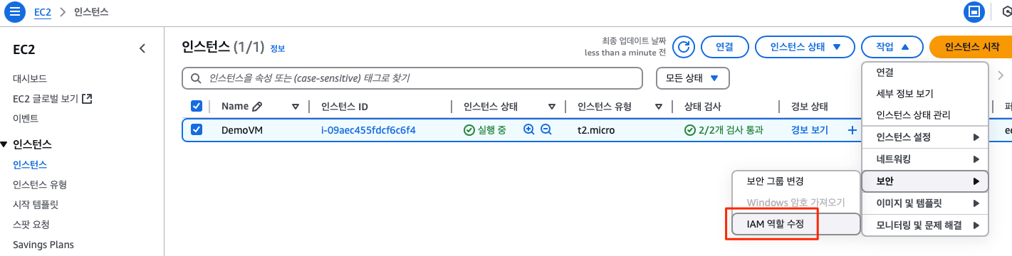 역할을 연결할 VM에서 보안 > IAM 역할 수정을 눌러 들어간 후 앞서 생성했던 역할을 선택해 수정해준다.
