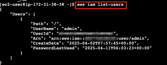 해당 VM에 접속해서 IAM 관련 명령어를 치면 오류없이 결과를 확인할 수 있다.