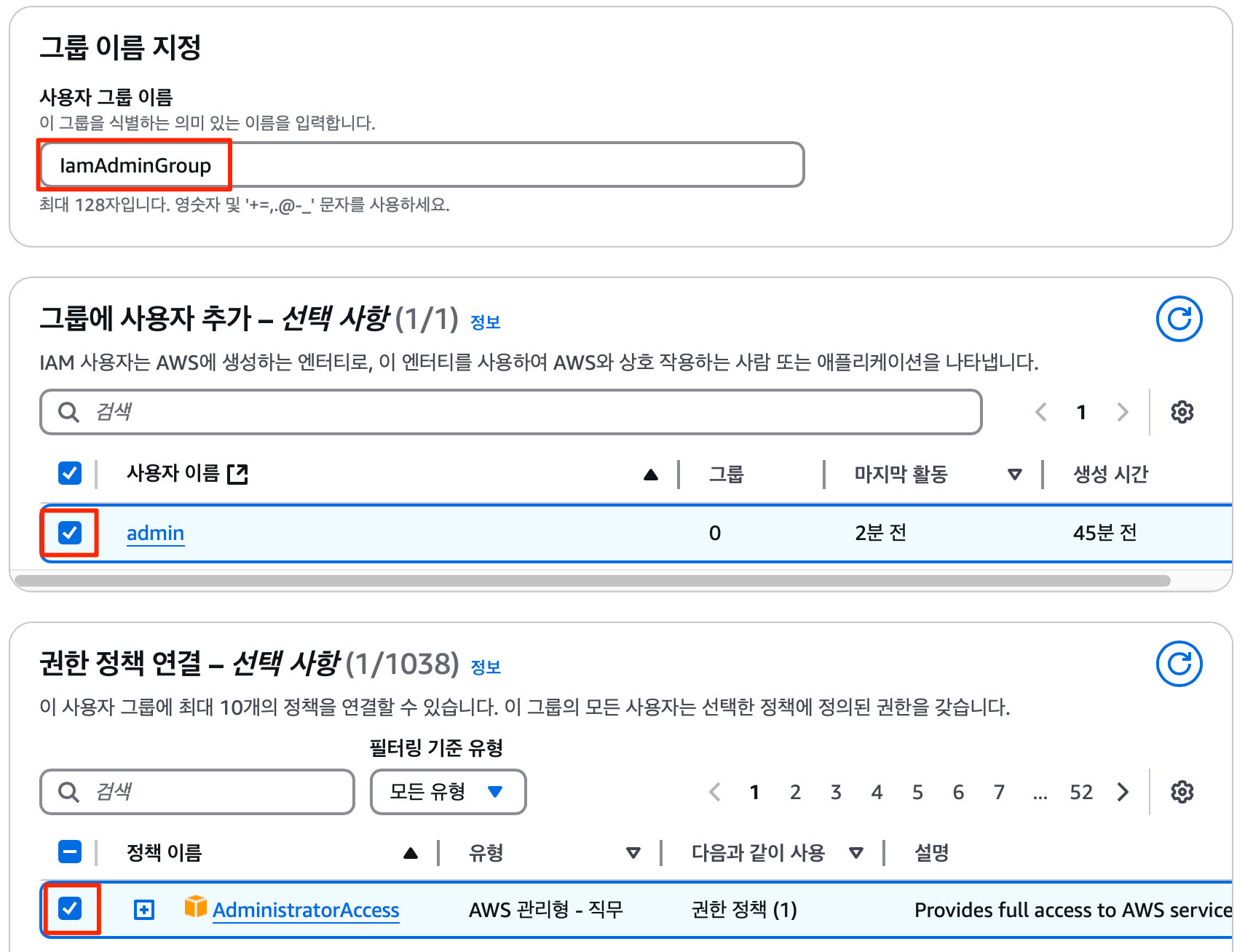 여러 사용자에게 동일한 권한을 설정하기 위해서는 그룹을 만들어 적용하는 것이 효율적이다. 우선 사용자 그룹을 먼저 생성해야 하는데, IAM > 액세스관리 > 사용자그룹 순으로 페이지에 접속하여 새로운 그룹 생성을 시작한다. 아래와 같이 그룹 이름, 그룹에 추가할 사용자, 그리고 적용하고자 하는 권한정책까지 한 번에 설정할 수 있다.