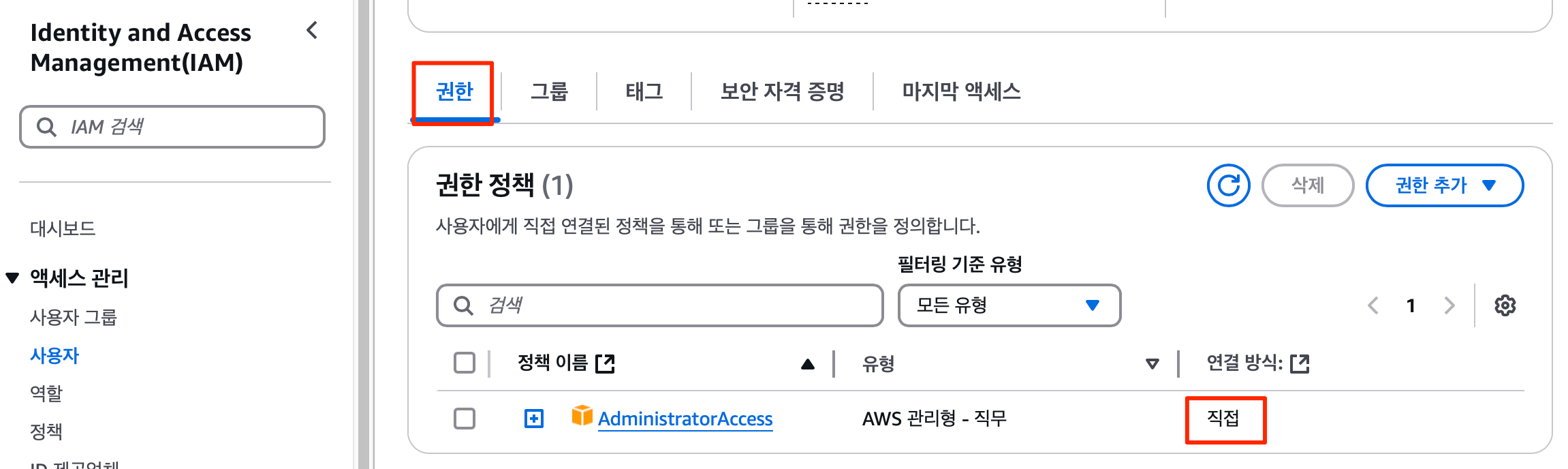 IAM > 액세스관리 > 사용자 순으로 페이지에 접속하여 권한을 설정할 사용자를 클릭한다. 그 후 [권한] 탭에서 권한추가 버튼을 눌러 원하는 권한정책을 선택한 후 적용하면 아래와 같이 직접 연결한 방식으로 정책이 설정되었음을 확인할 수 있다.